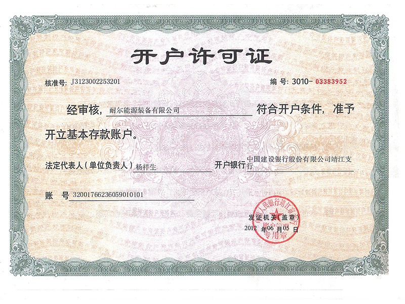 耐尔能源装备有限公司开户许可证